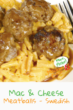 - » Preheat oven to 400 degrees.» Combine milk and breadcrumbs in a large bowl, then let stand 5 minutes.» Add onion, meat, egg, and salt and pepper, and stir until combined well.» Shape the meat into walnut-sized meatballs, and place on a lightly oiled cookie sheet, leaving space between them.» Bake meatballs. Turn them after 10 minutes, and then every 5 minutes after that, so that they brown on all sides.» Bake 25-30 minutes, or until well browned.» While meatballs are baking, make gravy according to package directions.» Prepare macaroni & cheese with milk and margarine according to directions on the box, or use your favorite variation.» Serve macaroni & cheese with meatballs and gravy on top.