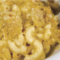 * White Sauce * Cheddar + Fontina* Worcestershire + cayenne pepper* Buttered Italian breadcrumbs