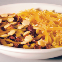 » Prepare macaroni & cheese with milk and margarine according to directions on the box, or your favorite variation.» While macaroni is cooking, heat chili in a saucepan.» When macaroni & cheese is ready, scoop macaroni into one side of a bowl, and chili into the other. Repeat for second bowl.» Scatter Cheddar on top of the bowls, and top chili side with oyster crackers.